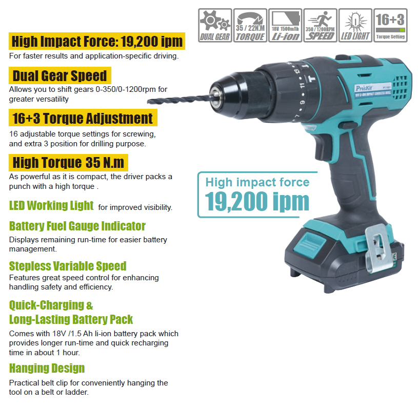 - 16 adjustable torque settings for screwing, and extra 3 position for drilling purpose.